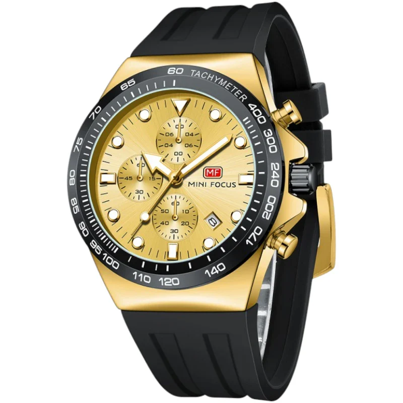 تخطف ساعة Mini Focus MF0488G الأنظار في هذا الإصدار الذهبي (Gold Edition) الذي يجمع بين بريق الذهب وفخامة الأسود. يأتي الهيكل والميناء بلون ذهبي "شامبانيا" بتشطيب أشعة الشمس (Sunray) الذي يعكس الضوء ببراعة، محاطاً بإطار "تاكيميتر" أسود يبرز الطابع الرياضي للساعة.