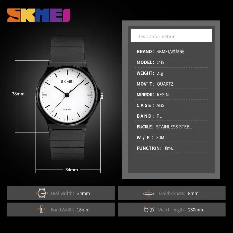 الساعة خفيفة الوزن بشكل استثنائي (21 جرامًا فقط)، مما يضمن لكِ راحة فائقة طوال اليوم. يكتمل تصميمها بسوار أسود ناعم ومريح مصنوع من مادة البولي يوريثان (PU) عالية الجودة. بفضل حركة الكوارتز الدقيقة، فإن ساعة سكمي 1419 ليست فقط إكسسوارًا أنيقًا، بل هي أداة موثوقة لحفظ الوقت تناسب جميع مناسباتك.