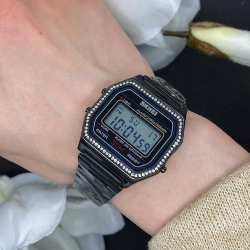 Skmei 1474 ساعة رقمية متعددة الوظائف للسيدات من الكريستال الأسود مقاومة للماء من الفولاذ المقاوم للصدأ