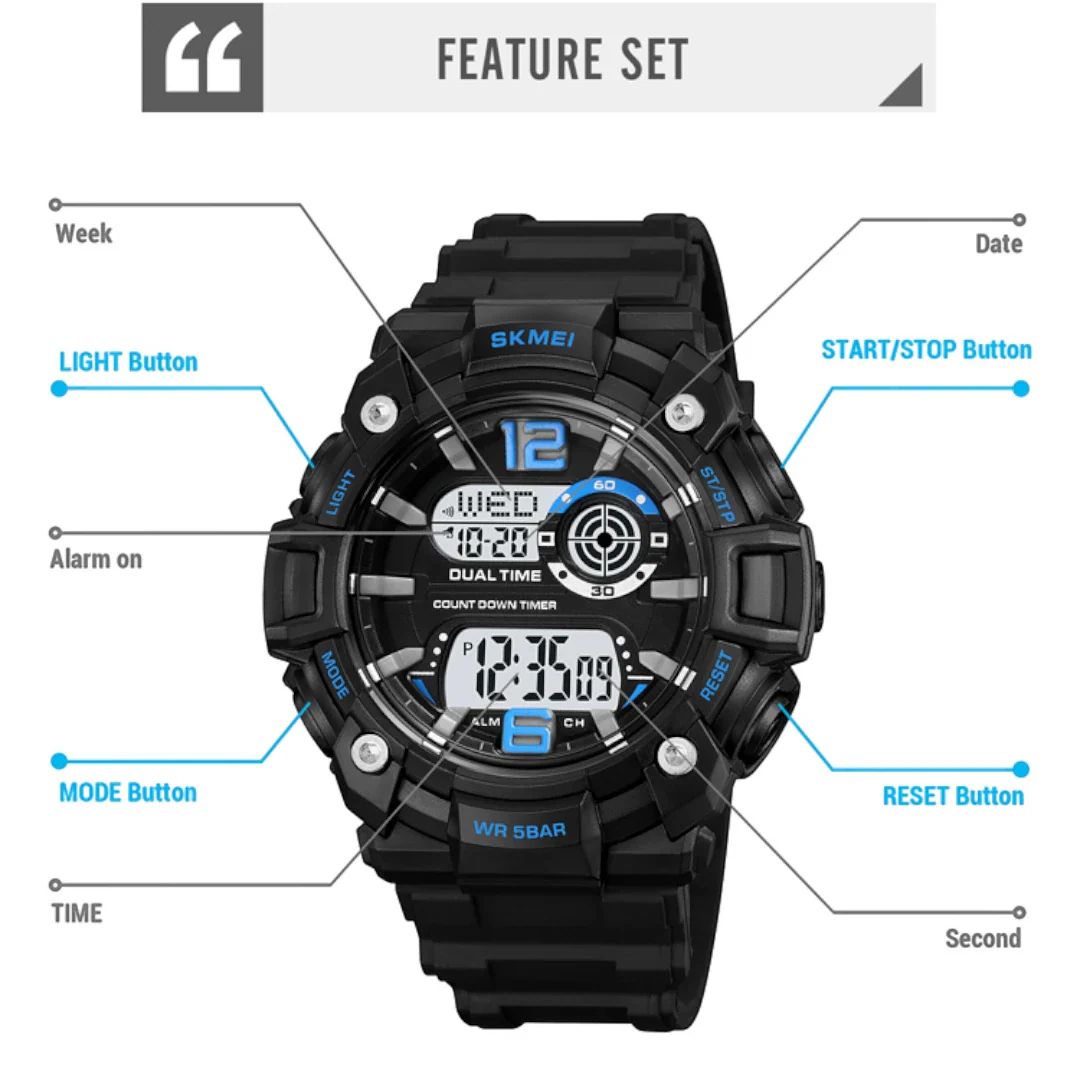 نقدم لكم ساعة سكمي 2018، وهي قطعة تتميز بتصميمها العصري والجريء الذي يجمع بين الخطوط الحادة والمظهر المستقبلي. يأتي هيكل الساعة باللون الأسود القوي، ويكتمل بشاشة ذات خلفية بيضاء عالية الوضوح، مما يخلق تباينًا رائعًا ويسهل قراءة الوقت والمعلومات بلمحة واحدة.